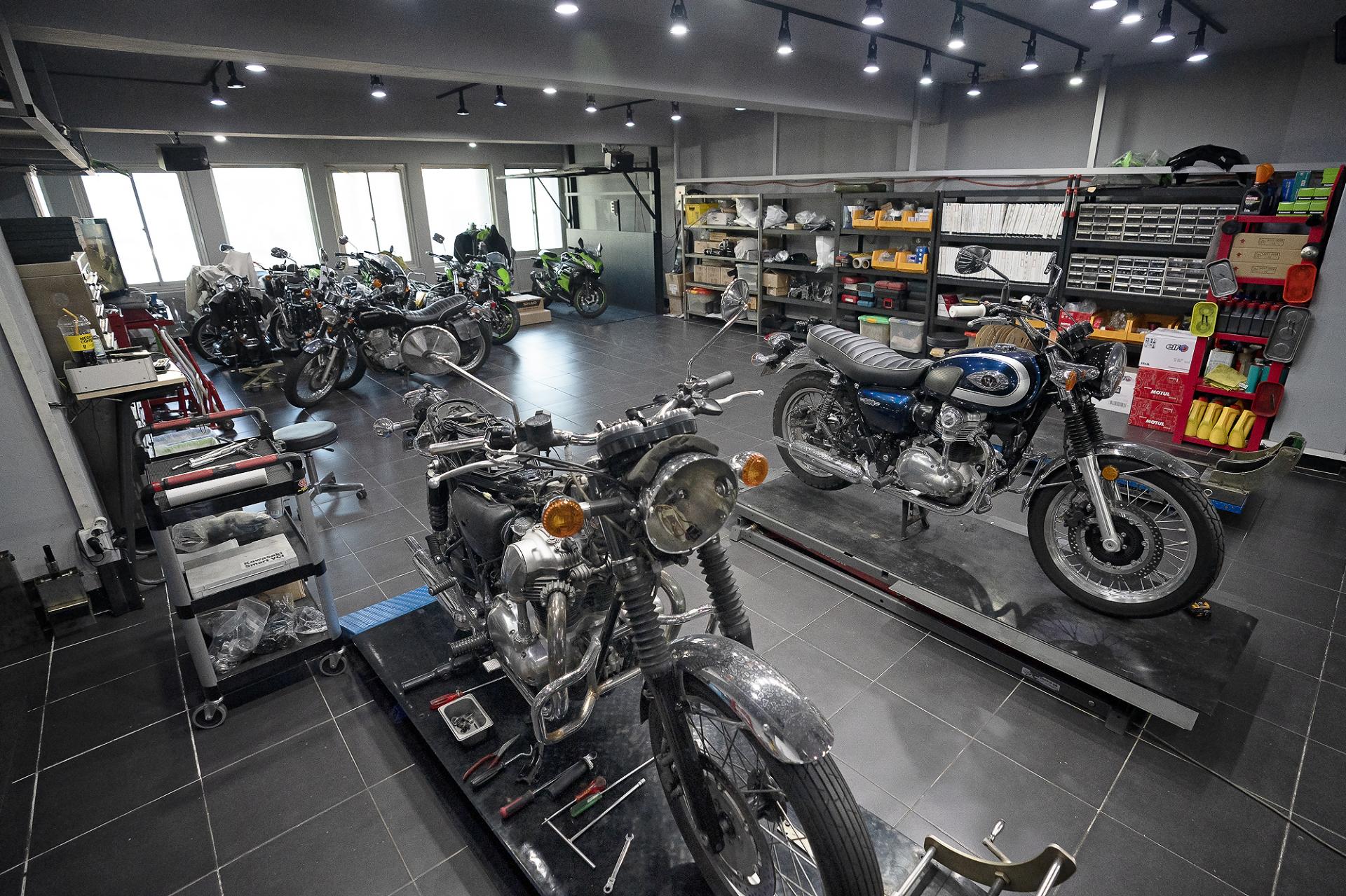 서울 용산구에 있는 바이코스에는 현재 김진태 대표를 비롯한 정비를 전담하는 김도군 실장, 매장관리 및 정비 담당 박준호 대리를 포함한 총 3명이 ‘최고의 제품’을 ‘최상의 상태’로 판매하고 유지하기 위해 분주하게 움직인다. 매장은 전시공간 40평, 정비실 40평, 부품실 20평의 규모로 얼마 전 내부 리모델링 마친 덕분에 블랙과 라임그린 컬러로 조화되어 가와사키만의 아이덴티티를 물씬 풍긴다.